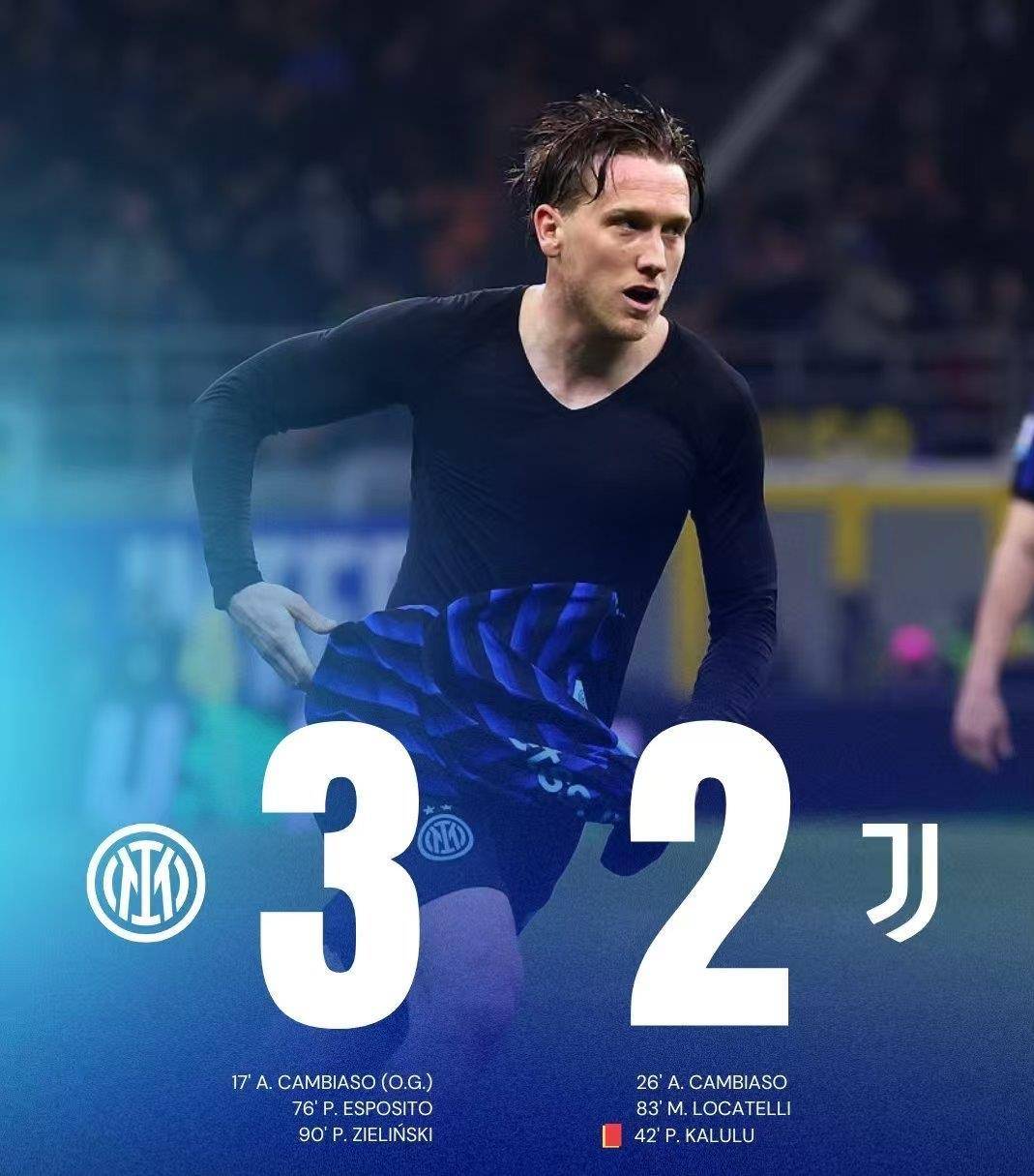 当泽林斯基那脚穿裆远射窜入网窝,整个梅阿查陷入疯狂。 这粒进球终结了国米联赛主场对尤文长达9年的不胜尴尬纪录,意义非凡。 积分榜上8分的领先优势,让争冠主动权看起来无比牢固。 然而,比赛的过程远比结果曲折。 国米凭借坎比亚索的乌龙球幸运取得领先,却被同一个对手迅速将功补过扳平。 即便对手核心后卫卡卢卢在第43分钟争议染红离场,占据人数和场面绝对优势的国米,也未能迅速终结悬念。