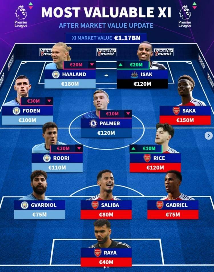 德转列英超最贵阵:哈兰德、萨卡领衔,曼城+枪手9人在列 admin 2025年06月02日 09:30 105 0 直播吧6月1日讯 德转不久前更新了英超球员身价,并盘点了目前英超身价最贵阵容,其中阿森纳5人、曼城4人在列,具体如下:门将:拉亚(阿森纳,4000万欧)后卫:格瓦迪奥尔(曼城,7500万欧),萨利巴(阿森纳,8000万欧)、加布里埃尔(阿森纳,7500万欧)中场:福登(曼城,1亿欧)、罗德里(曼城,1.1亿欧)、帕尔默(切尔西,1.2亿欧)、赖斯(阿森纳,1.2亿欧)、萨卡(阿森纳,1.5亿欧)前锋:哈兰德(曼城,1.8亿欧)、伊萨克(纽卡,1.2亿欧) 标签: #英超 #阿森纳 #哈兰德 #萨卡 #切尔西 #拉亚 #身价 #曼城