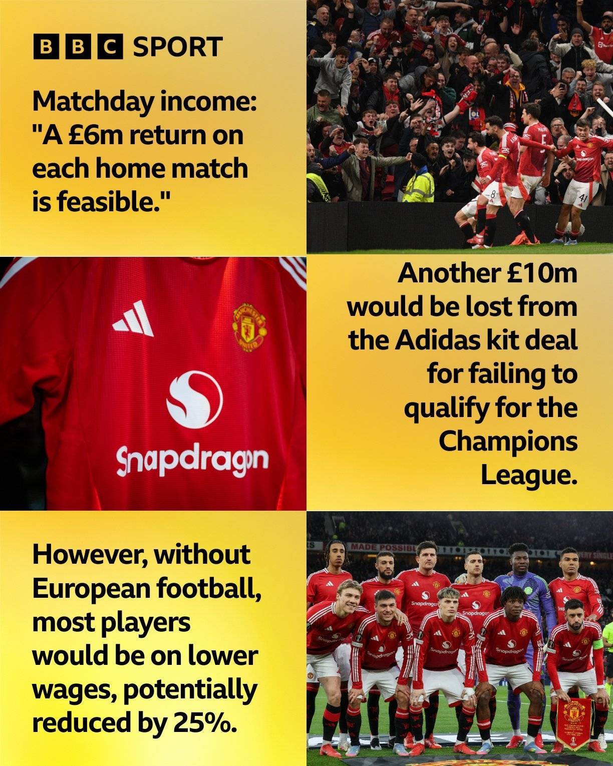 如果曼联无缘欧冠,专家预估比赛日收入损失在2400万-4800万英镑之间。此外赞助商阿迪达斯还会扣罚1000万英镑的赞助。但有一点“好处”在于,无缘欧战将使曼联阵中球员的工资下降,降幅可能达到25%,这将使曼联的工资单进一步缩减。