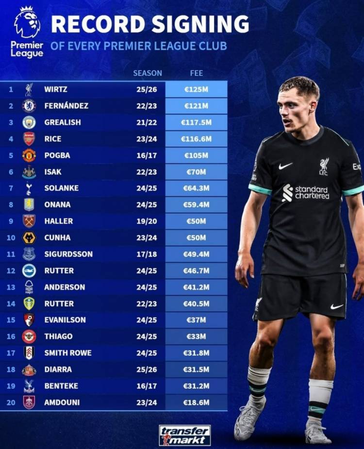 标签: #维尔茨 #利物浦 #曼联 #特尔 #阿森纳 #格拉利什 #恩佐 #切尔西 #曼城 #转会费 #标王 #本特克