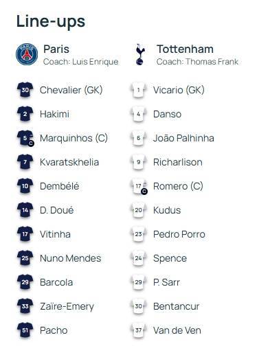 欧超杯-巴黎vs热刺首发:登贝莱、杜埃先发,波罗、理查利森登场 admin 2025年08月14日 05:30 84 0 直播吧8月14日讯 北京时间03:00,欧洲超级杯决赛,巴黎圣日耳曼对阵热刺,赛前双方首发阵容出炉!文字版首发更新中......欧洲超级杯是由欧足联主办的年度足球赛事,每年在欧冠冠军与欧联杯冠军之间进行一场对决。巴黎上赛季法甲26胜6平2负积84分稳坐联赛第1,夺得当季欧冠冠军;热刺上赛季英超11胜5平22负积38分位居联赛第17,最终夺得欧联杯冠军。 标签: #欧联 #欧联杯 #热刺 #登贝莱 #欧冠 #欧冠冠军 #欧洲 #联赛 #理查利森 #杜埃 #巴黎 #杜埃先